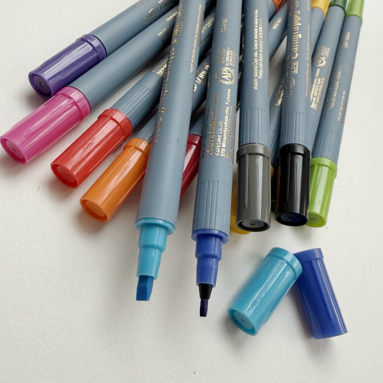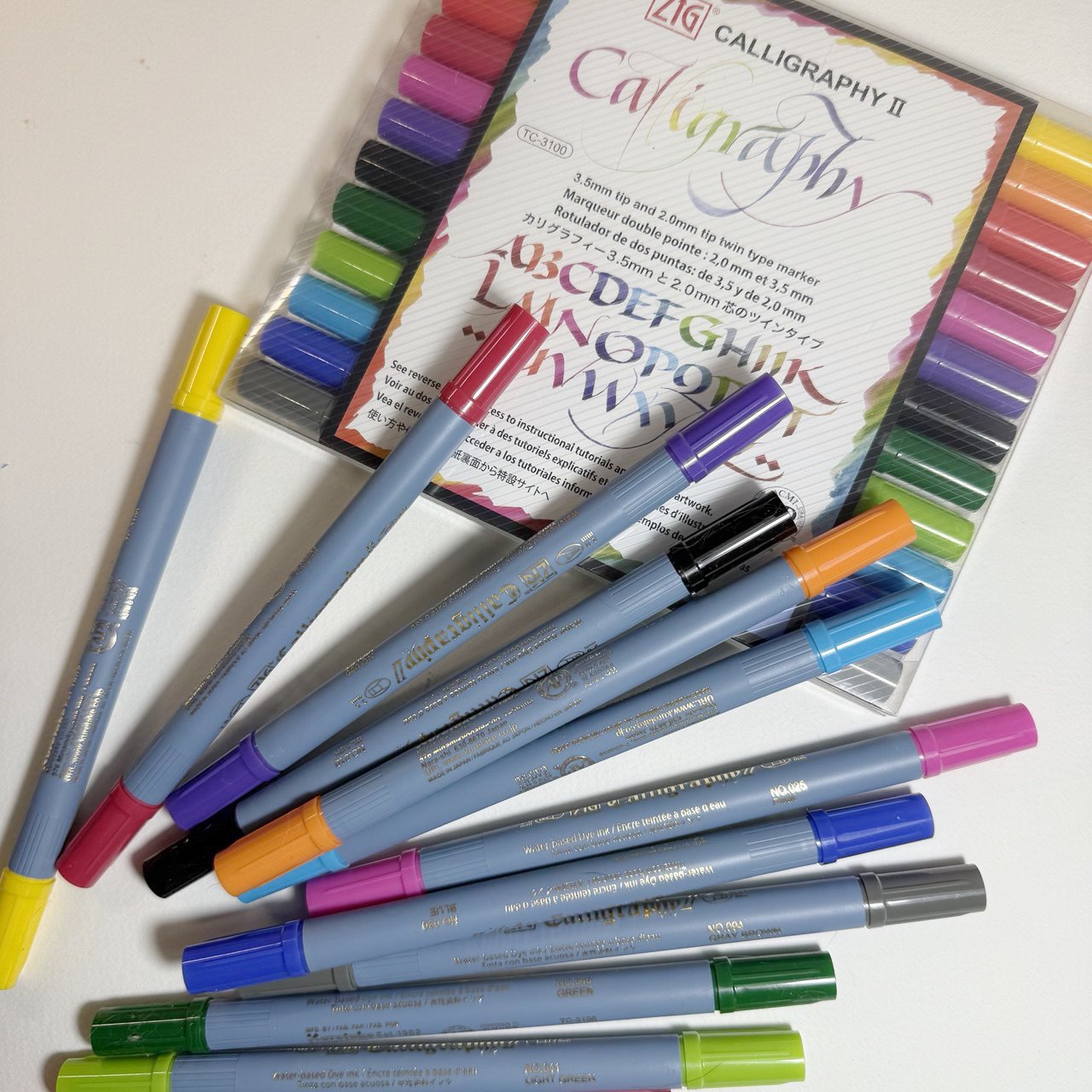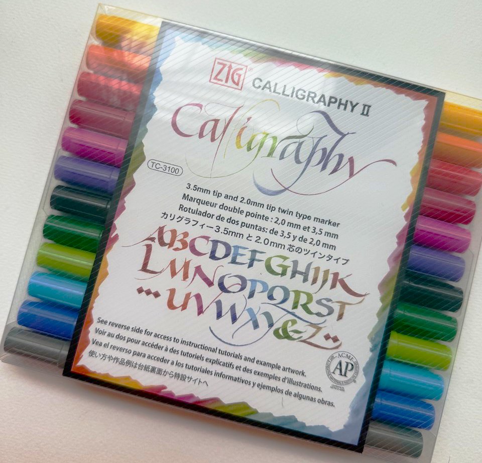Набір із 12 різнокольорових двосторонніх каліграфічних маркерів з пласким кінчиком ZIG Calligraphy II японської фірми Kuretake. Ширина пишучої частини з одного боку – 2 мм, з іншого – 3,5 мм. Підійде для написання в’язі, готики, італійського курсиву та інших стилів, які пишуться широким пером. Маркери прості у використанні, їх зручно носити з собою. Фактично це альтернатива ручці Pilot Parallel Pen та класичному пласкому перу. Чорнило на водній основі.