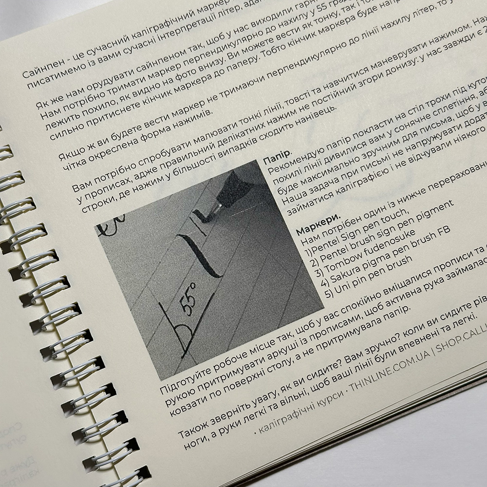 Прописи з сучасної каліграфії маркером сайнпеном у зручному форматі. Ідеально підходять для початківців. Прописи базуються на кириличній абетці. Містять базові вправи, малі та великі літери, цифри, розчерки, слова та фрази для копіювання. В кінці прописів є дві сторінки розліновки, які можна підкладати під ваш папір. Якісний папір кольору айворі, по якому добре писати чорнилом або тушшю.